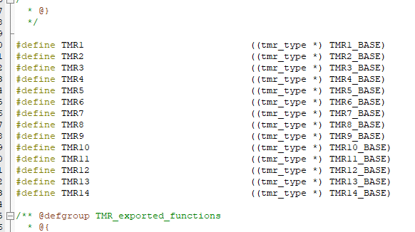 Находим строчку tmr_base_init(TMR1, 9999, (crm_clocks_freq_struct.ahb_freq / 10000) - 1). Здесь мы задаём время работы таймера. Формула такая: время_сек * 10000 - 1. То есть 9999 это 1 секунда, 999 это 100 мс, 29999 - 3 секунды. Обращаем внимание на надпись TMR1. Нажимаем F7, проект компилируется и нам теперь доступны переходы по телу проекта. Переходим по TMR1 и видим, что у нас можно сделать 14 таймеров: