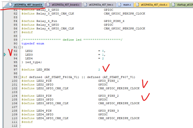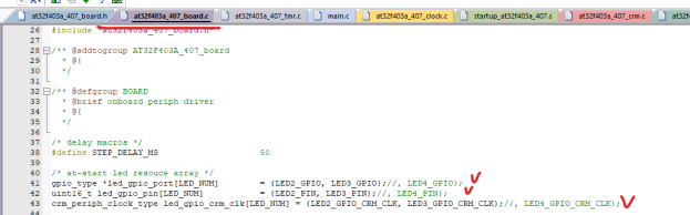 Нажимаем F12 на at32_led_off в теле main и переходим на эту функцию, прокручиваем код вверх и меняем (создаём) текcт объявления переменных LED, убираем лишнее