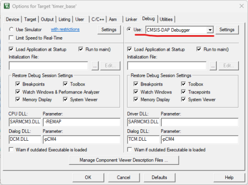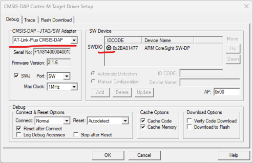 То есть у меня на плате внешний генератор подцеплен на PA14. Если у вас на другой ноге, то и меняете в трёх местах: GPIOA, GPIOB, GPIOC и так далее. С кодом разобрались, теперь надо настроить программатор для режима Debug. переходим в Options for Target, и выбираем CMSIS-DAP. Нажимаем далее Settings. Выбираем программатор.