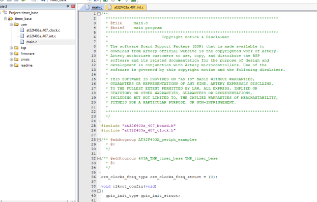 Открываем папку с примерами AT32F403A_407_Firmware_Library_V2.1.4\project\at_start_f403a\examples\tmr (это примеры таймеров). Находим папку timer_base. Как следует из названия, это базовый пример работы таймера. Открываем проект из папки mdk_v5. Всё стандартно и знакомо, не правда ли? Надо сказать спасибо, все примеры лежат по полочкам. Но осторожно, эти примеры для тестовой доски от Artery. В моём случае у меня уже есть плата.