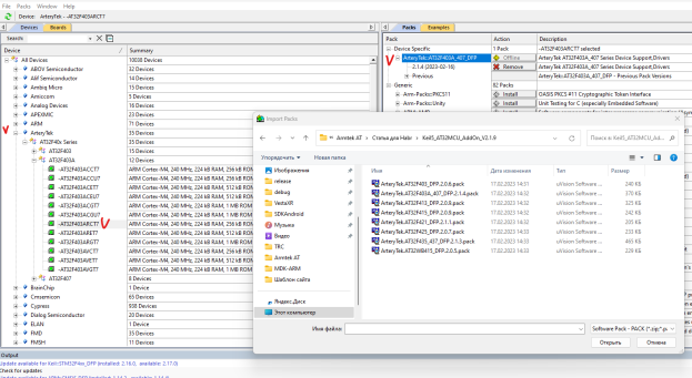 Итак, запускаем Keil. Нажимаем Pack installer. Далее Import Packs, находим расположение папки Keil5_AT32MCU_AddOn_V2.1.9. Выбираем наш МК и нажимаем "Открыть". В итоге получаем такую картинку: