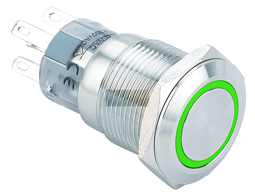 Кнопка промышленная Onpow LAS1-AGQ-11E/G/220V/S антивандальная, Круглый, M19, Сталь, с подсветкой, Без фиксации [Momentary], IP40