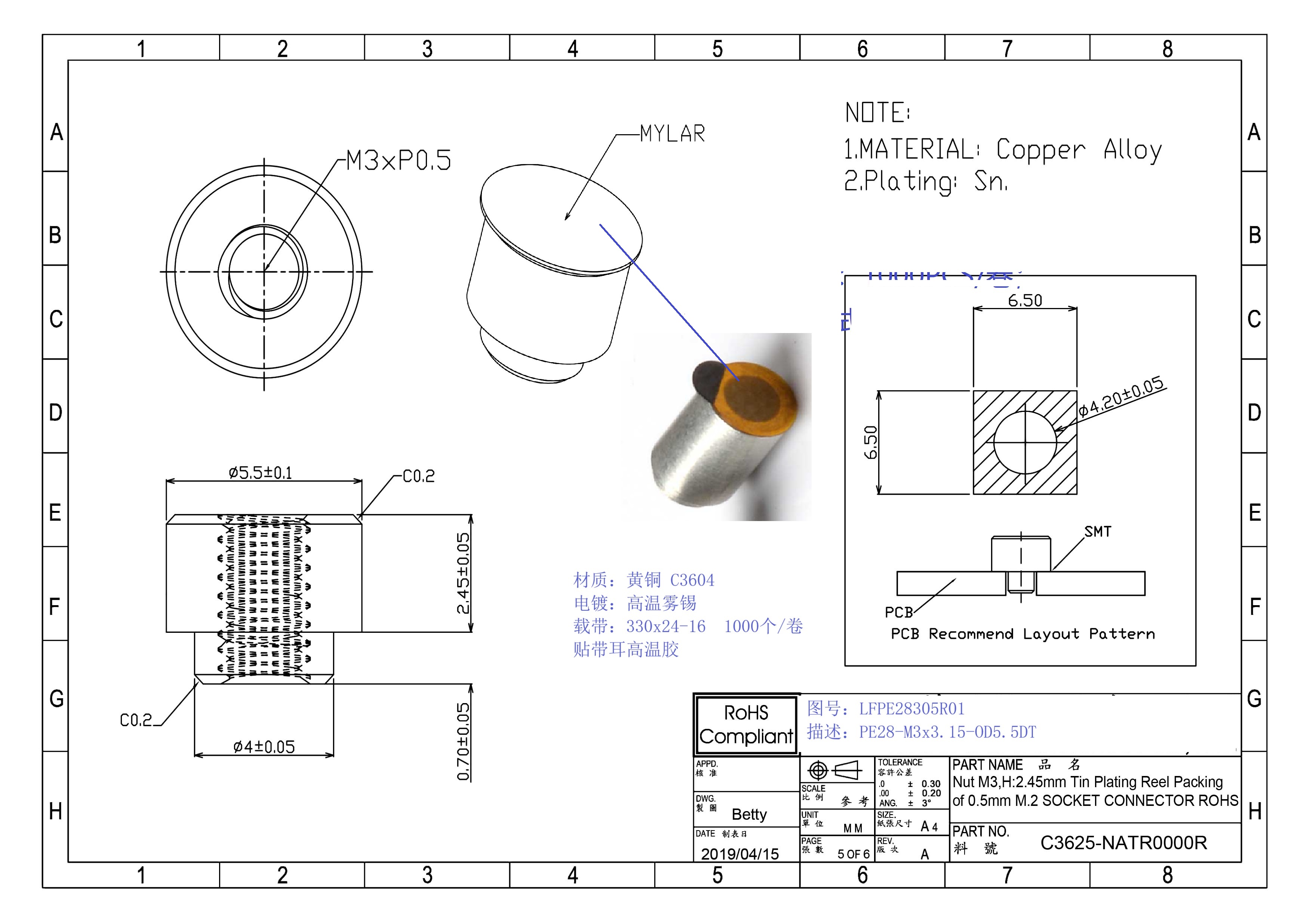 Cтойка на плату (Бонка) In-sail LFPE28305R01, высота 2.45мм, для использования с разъемами М.2 (4.2мм)